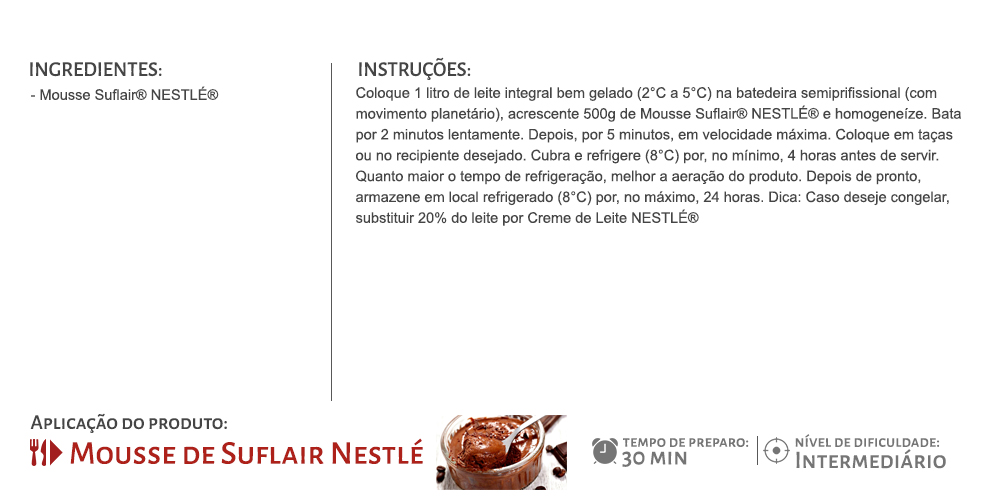 Suflair® mousse de chocolate 500g faz parte da linha de sobremesas nestlé®, que oferece produtos fáceis e rápido de preparar.
